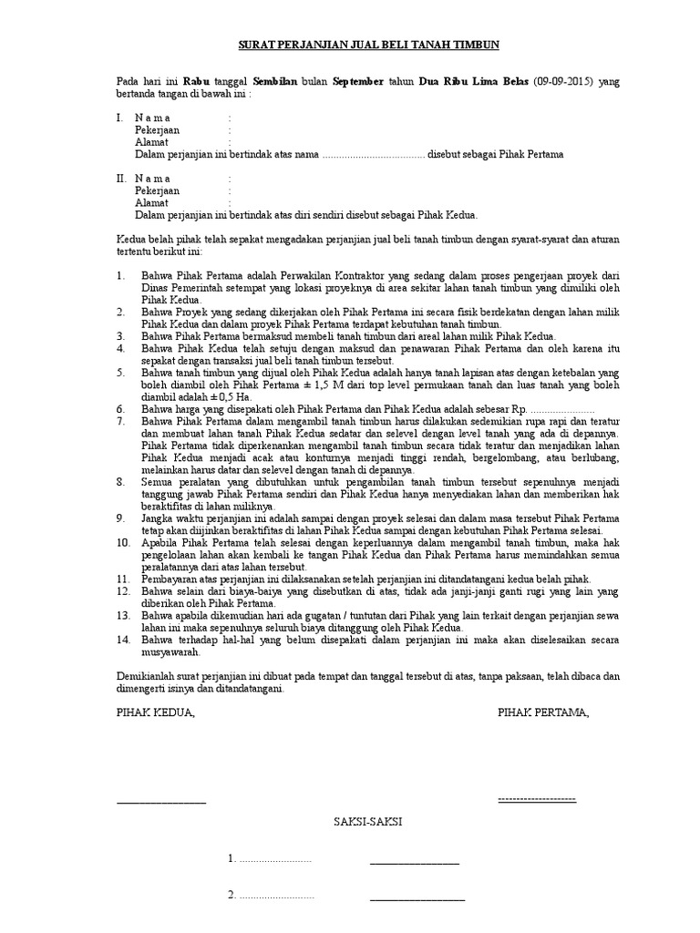 Bisa jadi tanah tersebut merupakan warisan dari orang tua dan ingin menjualnya, baru kemudian dilakukan pengurusan pengalihan pemilik dari tanah dimaksud. Penjual menyerahkan sebidang tanah kepada pembeli sesuai dengan ukuran yang tertera pada surat jual beli dan pembeli. Sahabat 99, sudahkah lihat contoh surat jual beli tanah dalam artikel ini? Jika anda mencari surat jual beli doc, maka anda memang akan dimudahkan. Surat jual beli tanah merupakan sebuah surat yang menjadi tanda bukti bahwa pihak penjual telah menyerahkan kepemilikan hak atas tanahnya kepada pembeli. Silahkan cek dan telusuri hanya di website semoga contoh surat dalam bentuk format doc (word) dan pdf yang kami lampirkan tersebut dapat bermanfaat dan membantu anda yang membutuhkan. Pdf perolehan tanah oleh pemerintah daerah yang berasal. Dengan begitu penjual wajib menyerahkan tanah tersebut kepada pembeli dan begitupun sebaliknya, pembeli harus membayar uang senilai tanah tersebut dan berhak mendapatkan tanah tersebut. Contoh surat perjanjian jual beli tanah doc. Untuk lebih jelasnya, lamudi telah menyiapkan contoh surat perjanjian jual beli tanah dalam bentuk pdf dan word doc yang dapat anda gunakan untuk mempermudah proses ketika. Susuan surat perjanjian jual beli tanah. Hampir sebagian besar orang di daerah pedesaan mendapatkan tanah warisan yang sangat luas dari orang tua mereka. Surat kuasa tanah umumnya dipakai ketika terjadi proses jual beli tanah.